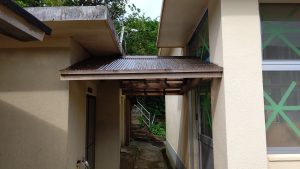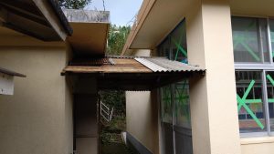 台風10号によって,トイレ前の渡り廊下のスレート屋根が飛ばされてしまいました。
