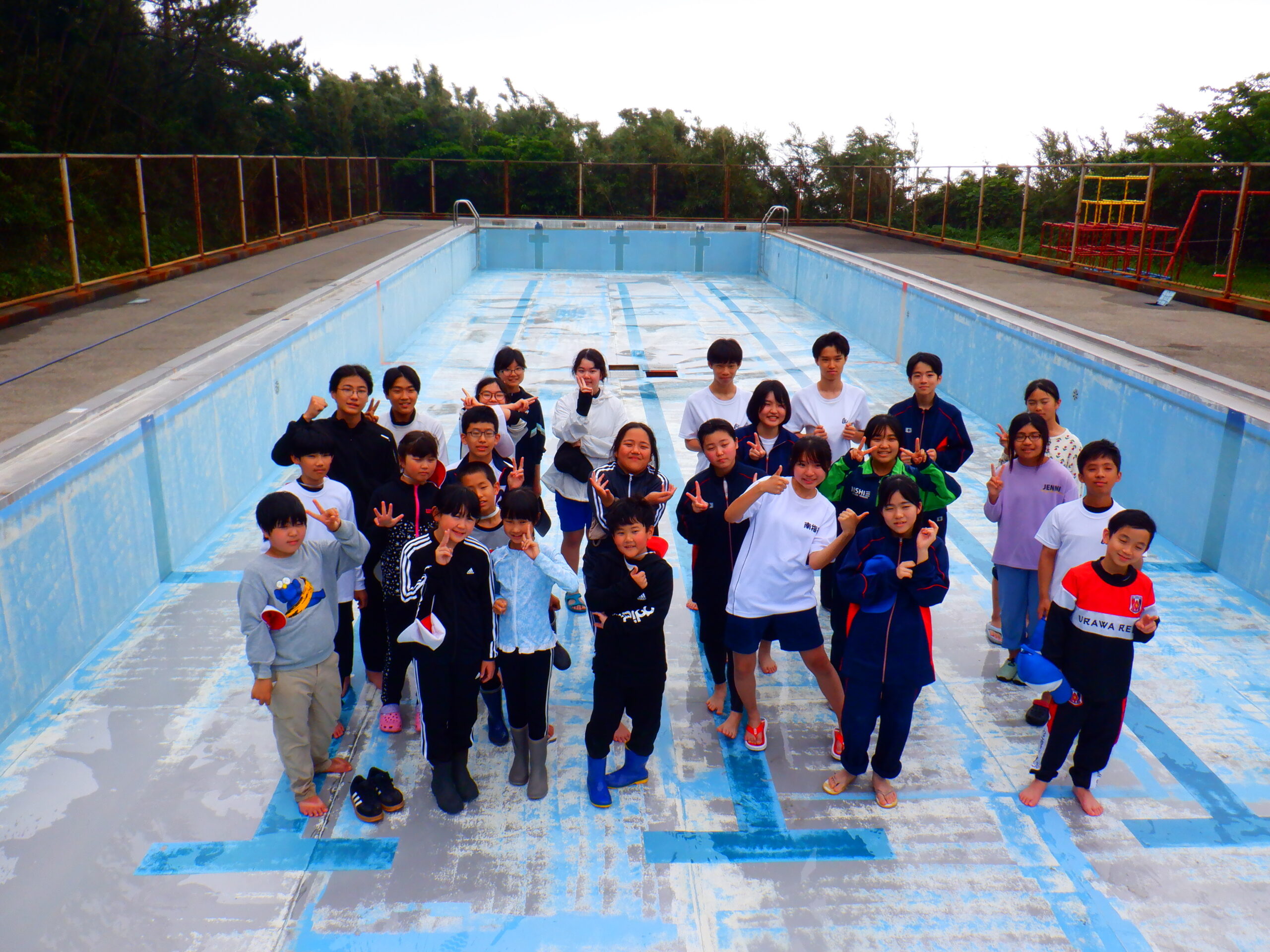 6月からの水泳学習に向けて,大里学園と片泊学園が協力して プール清掃を…