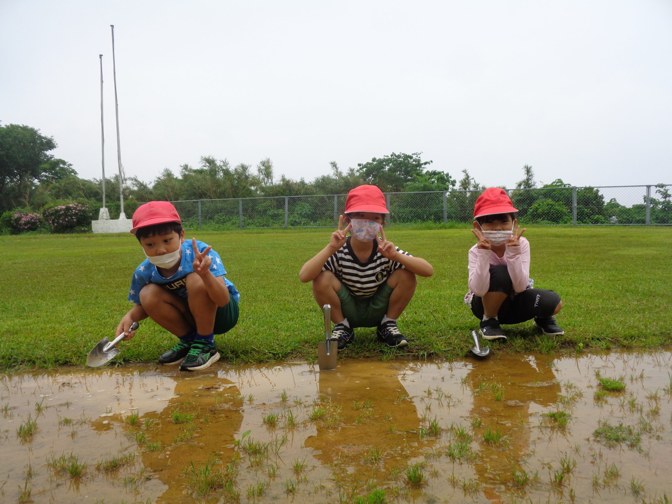 ⑥雨が止んだ隙に,外へ出て遊ぶ子ども。土の中にいる虫の「ケラ(おけら)」を捕まえたかったようです♪