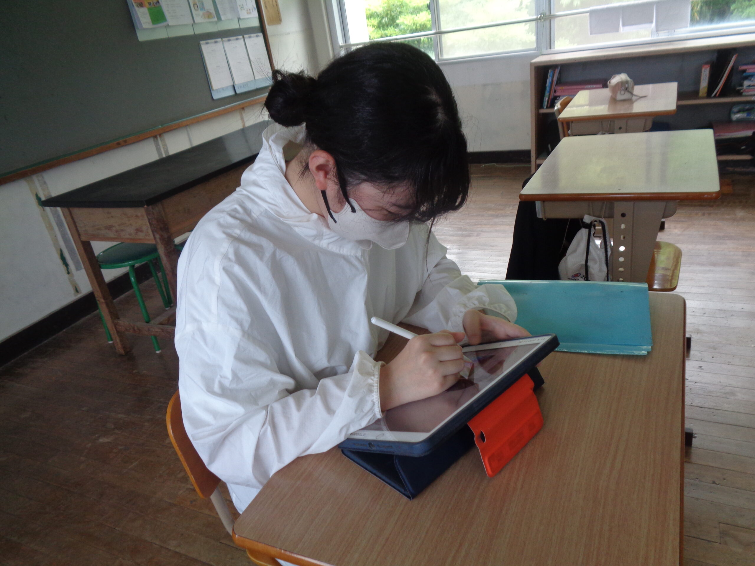 ③タブレットでイラストを描く子ども。自分の好きなことに,じっくり取り組みます☆