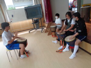 ⑤ジャンベの練習をする子ども。大阪万博での発表に向けて,練習あるのみ!