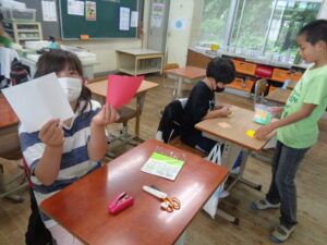 ①折り紙で遊ぶ子ども。「何を作ろうかなあ。」と悩みつつも,楽しそうです♪