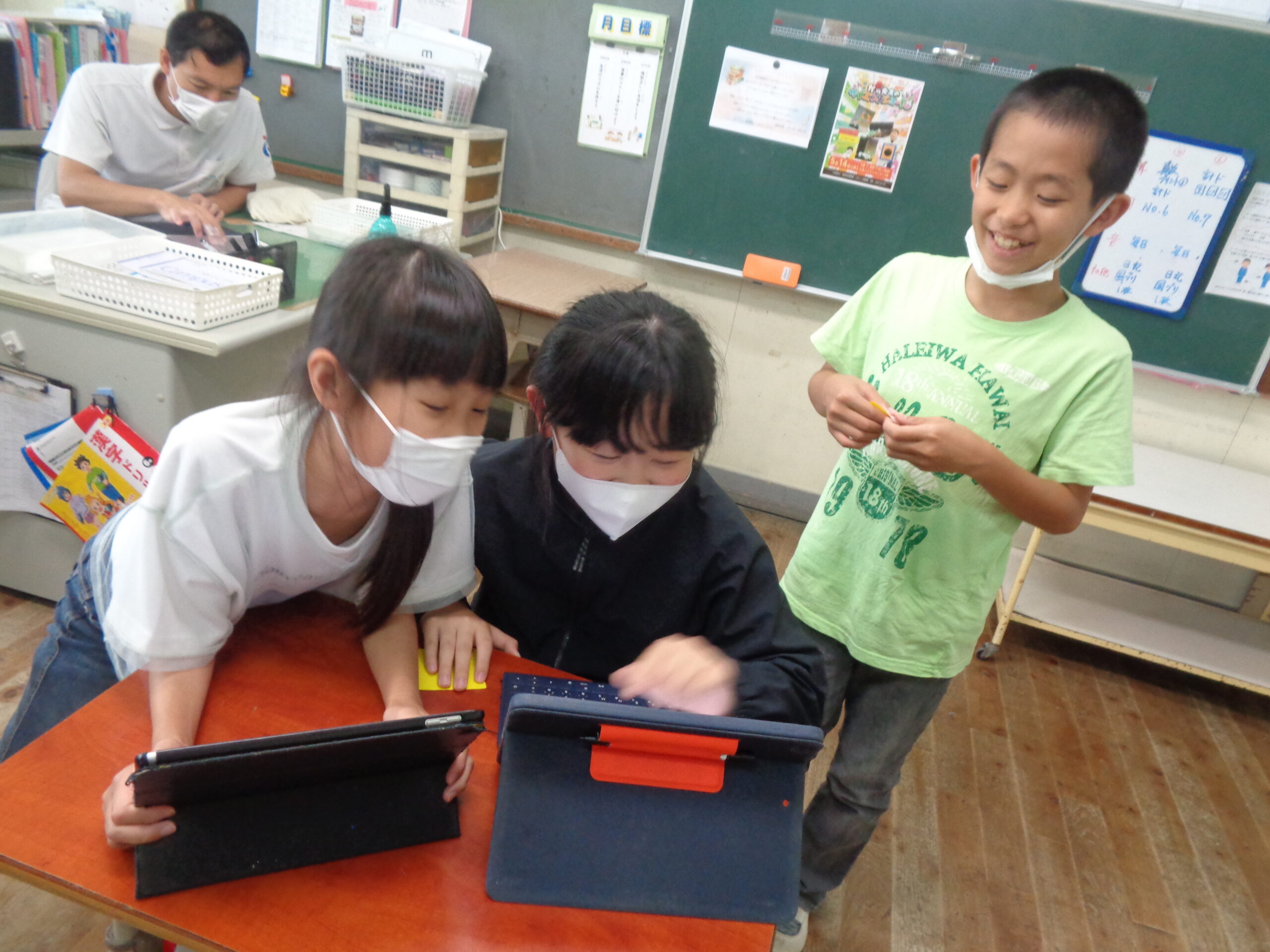 ④友だちと,タブレットを使う子ども。何を調べているのかな?楽しそうです♪