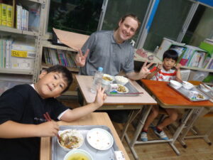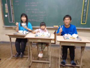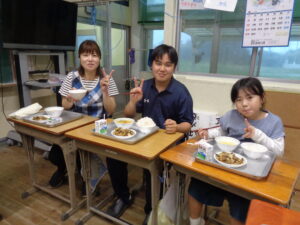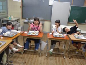 いつもは給食を各学年の教室で食べますが,今日はみんなで食べました。しかし,みんなとはいっても,1年生と4年生の2学年だけです。なぜかというと,6~9年生は「みしまっ子ジャンベツアー2025 in大阪」に参加しているからです。