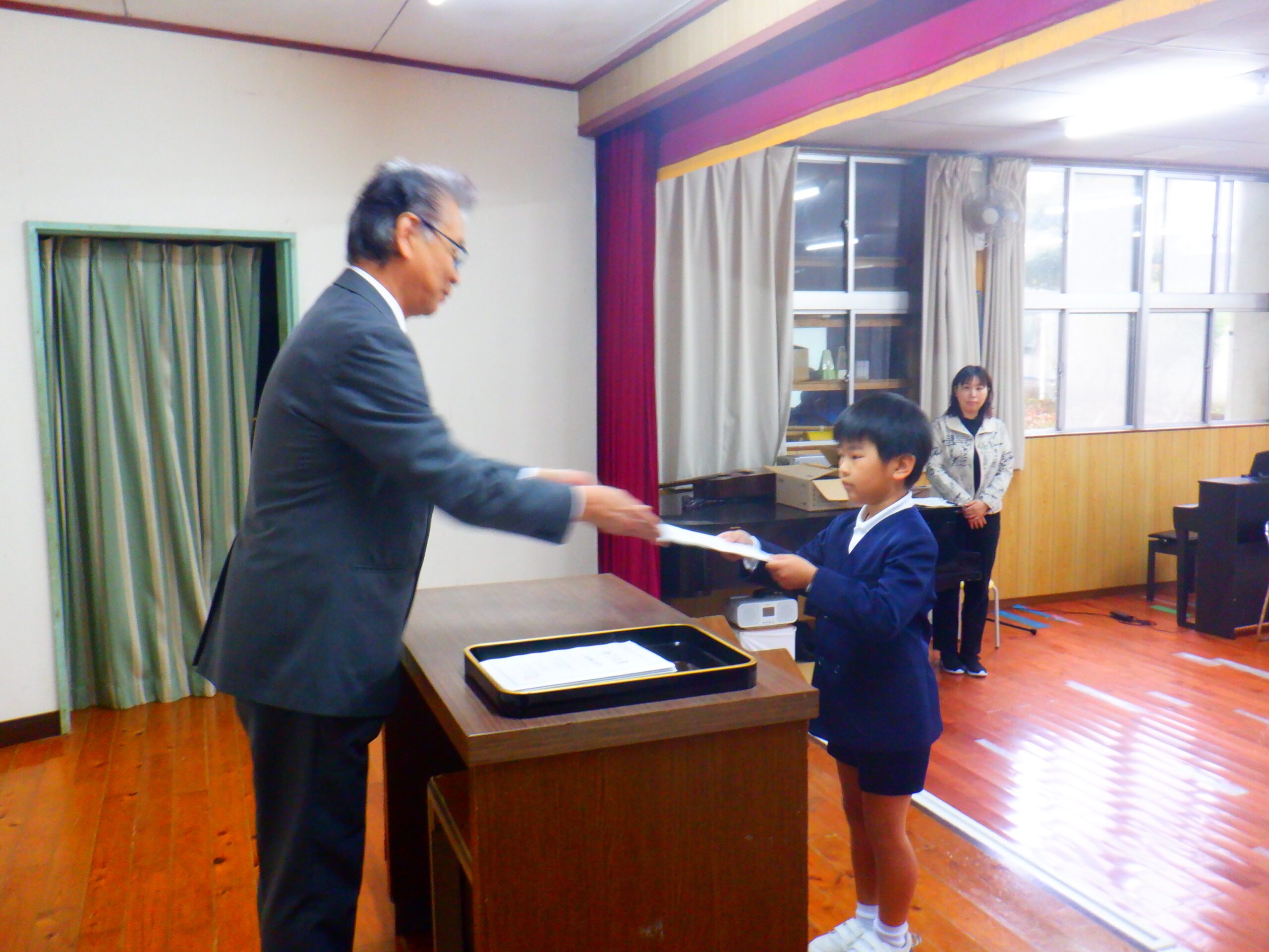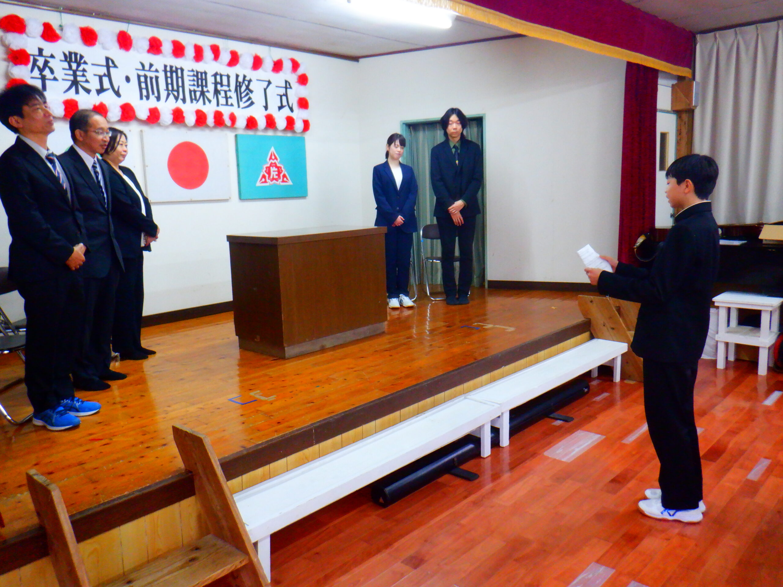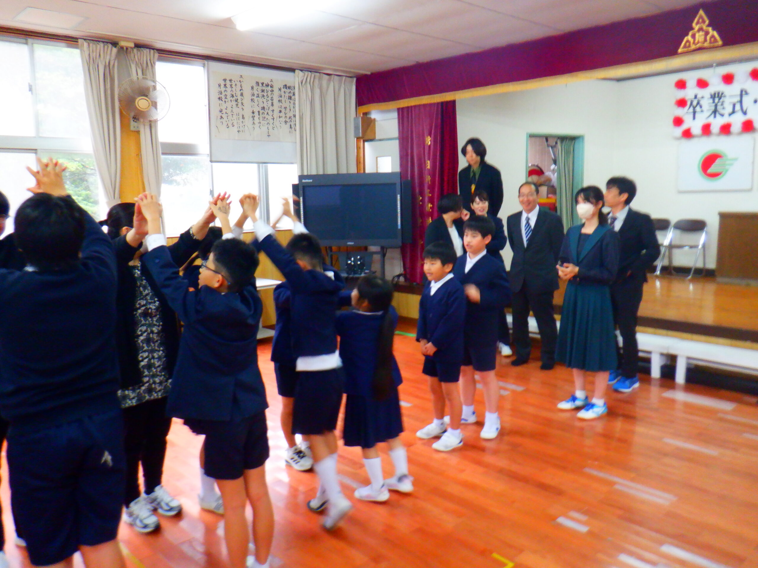 今日は、修了式と辞任式が行われました。 修了式では、一人ずつ校長先生から修了証書を授与して頂きました。 そして、代表の児童生徒が一年間の反省と来年度の抱負を発表しました。 そして、辞任式では転勤される先生方と最後のお別れをしました。それぞれの先生方との思い出が こみ上げてきました。次に転校する児童生徒とのお別れの式です。今年度は、5名の先生方と3名の 児童生徒が転出します。お別れは寂しいですがそれぞれの場所で頑張ってください。 最後に、職員バンドの解散ライブがありました。