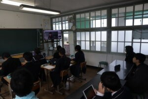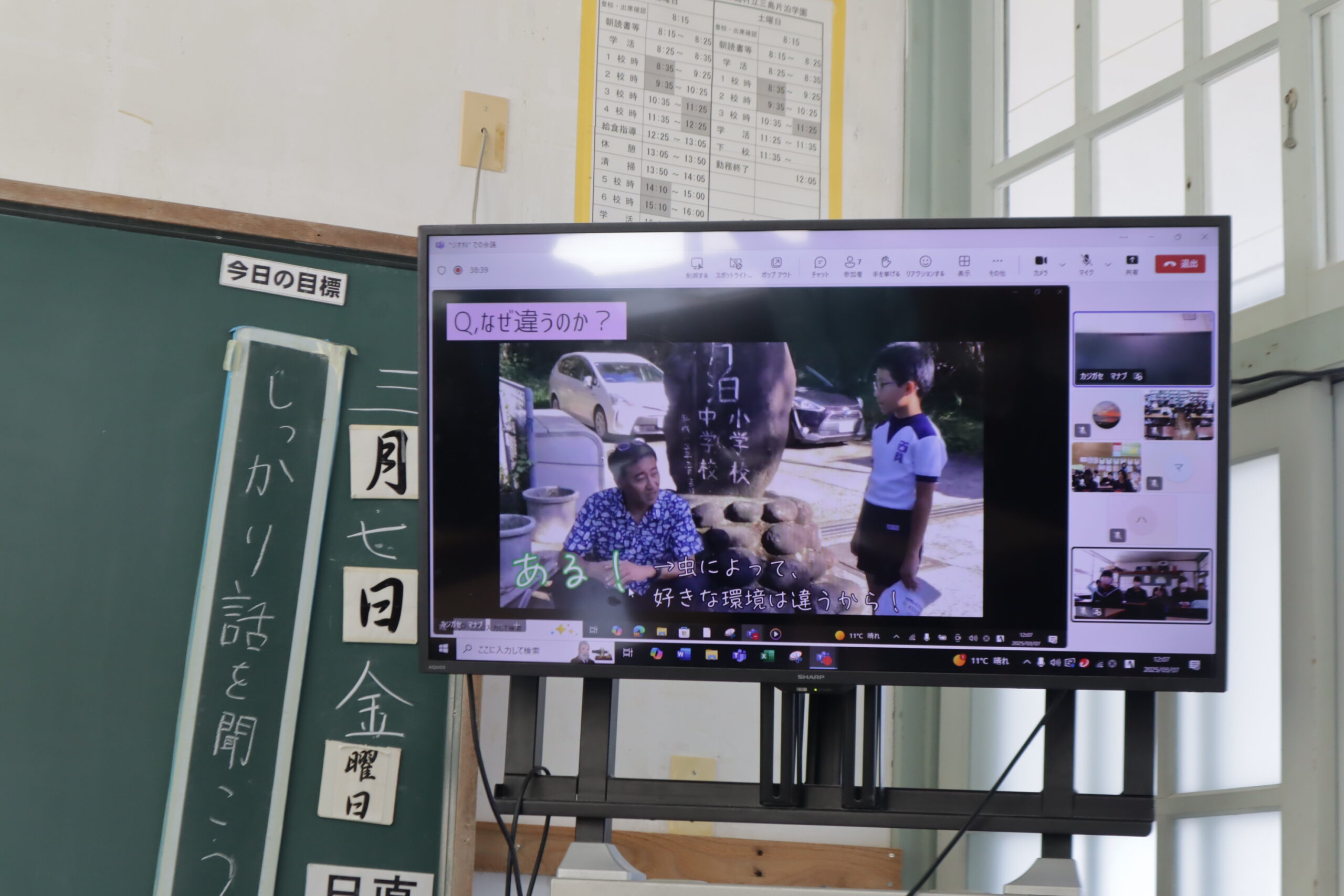 今日は、昨日の前期課程に引き続き後期課程で4校をオンラインで繋いでのジオ科の発表をしました。 各学園が、それぞれの島の特産や問題点などテーマを決めて発表する流れでした。片泊学園の7年生は、黒島で見られる昆虫や生態系についてインタビューしたものを動画にまとめ発表しました。 8年生は、片泊に伝わる歌「マノヤマ山頂」の歴史についてパンフレットにまとめたものを発表しました。 9年生は、片泊学園を紹介する動画を作成し、発表しました。 各学園とても素晴らしい発表でした。