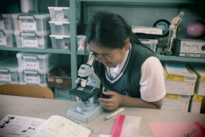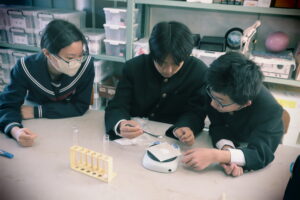 本格的に授業が始まっています。 今日の後期課程の理科の授業では、7年生は生物の単元で顕微鏡の使い方を学習しました。8年生は化学の単元で、次回行う炭酸水素ナトリウムの分解の実験準備をしました。9年生も化学の単元で、塩化銅水溶液の電気分解の実験を行いました。一人でまたは級友と協力しながら、テキパキ と観察・実験を行う姿は頼もしいです。