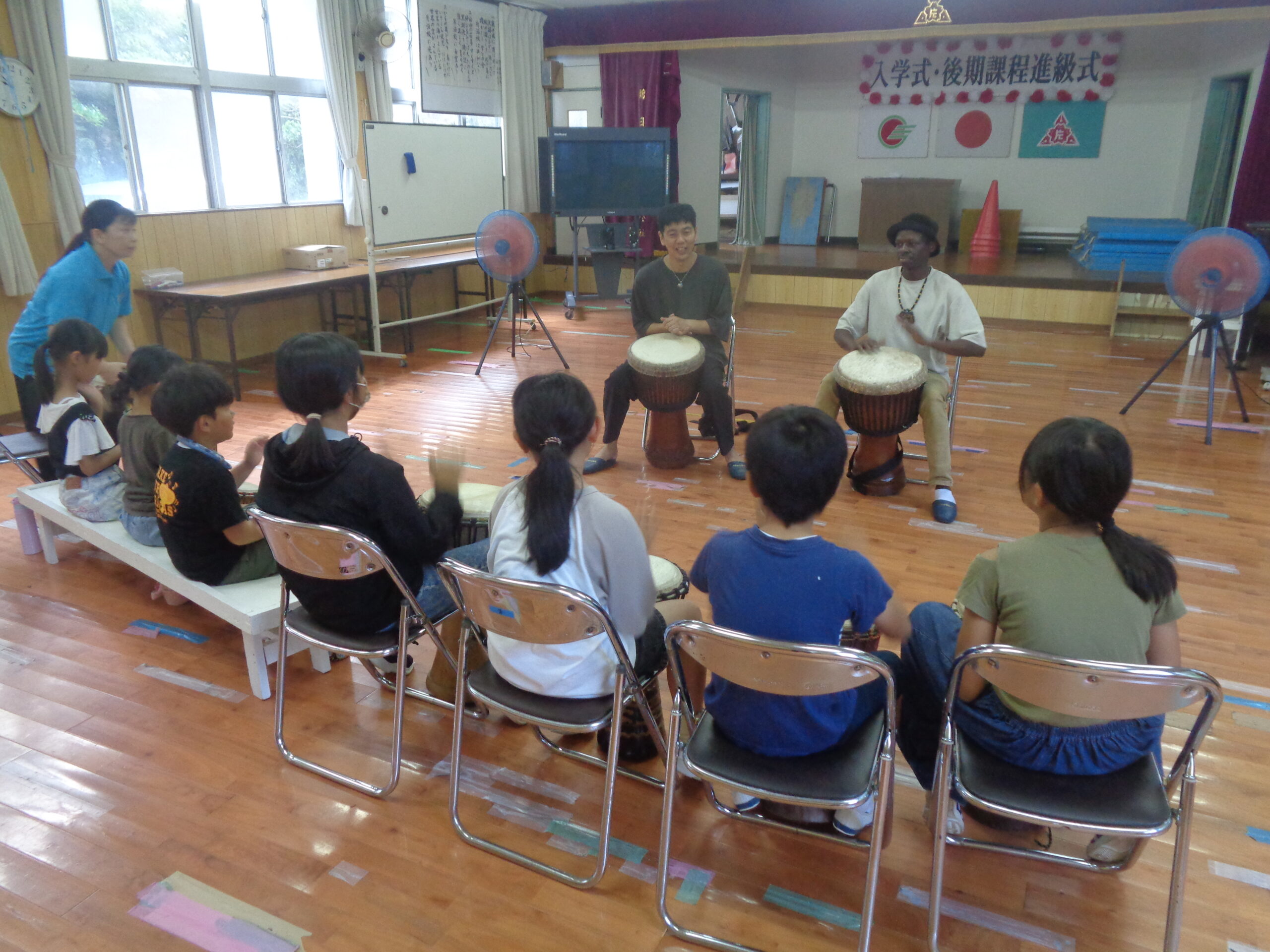 まずは,前期課程の子どもたち。リズムに合わせて,楽しくジャンベをたたきます。