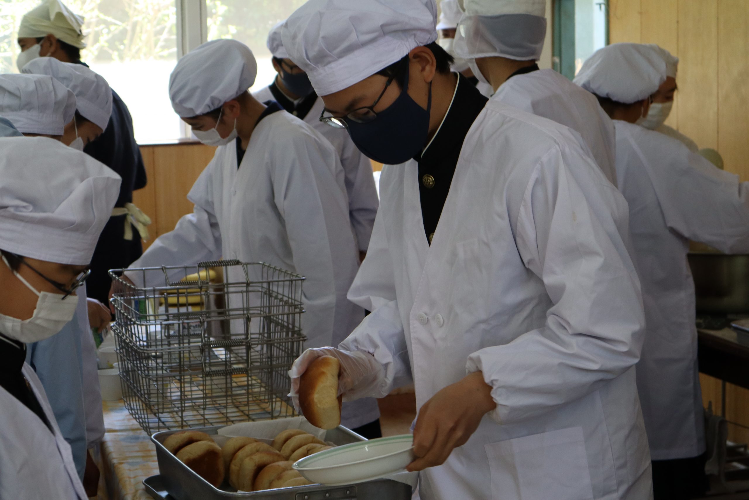 パンも手作りですので、ふわふわの温かいパンが食べられます。また、地域で採れるたけのこや芋類も使われていて、学校行事のたけのこ採りで自分たちで採ったたけのこも給食で食べることができます。