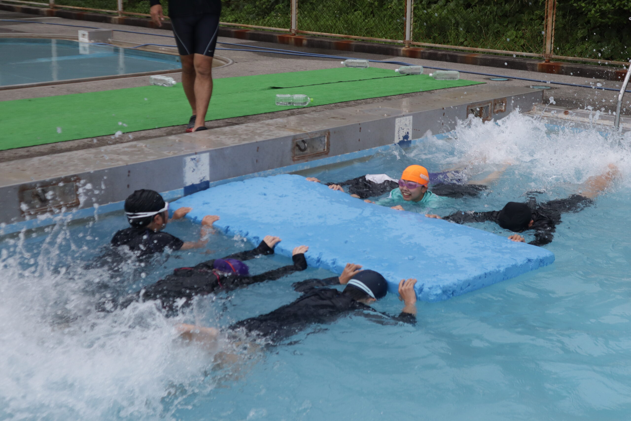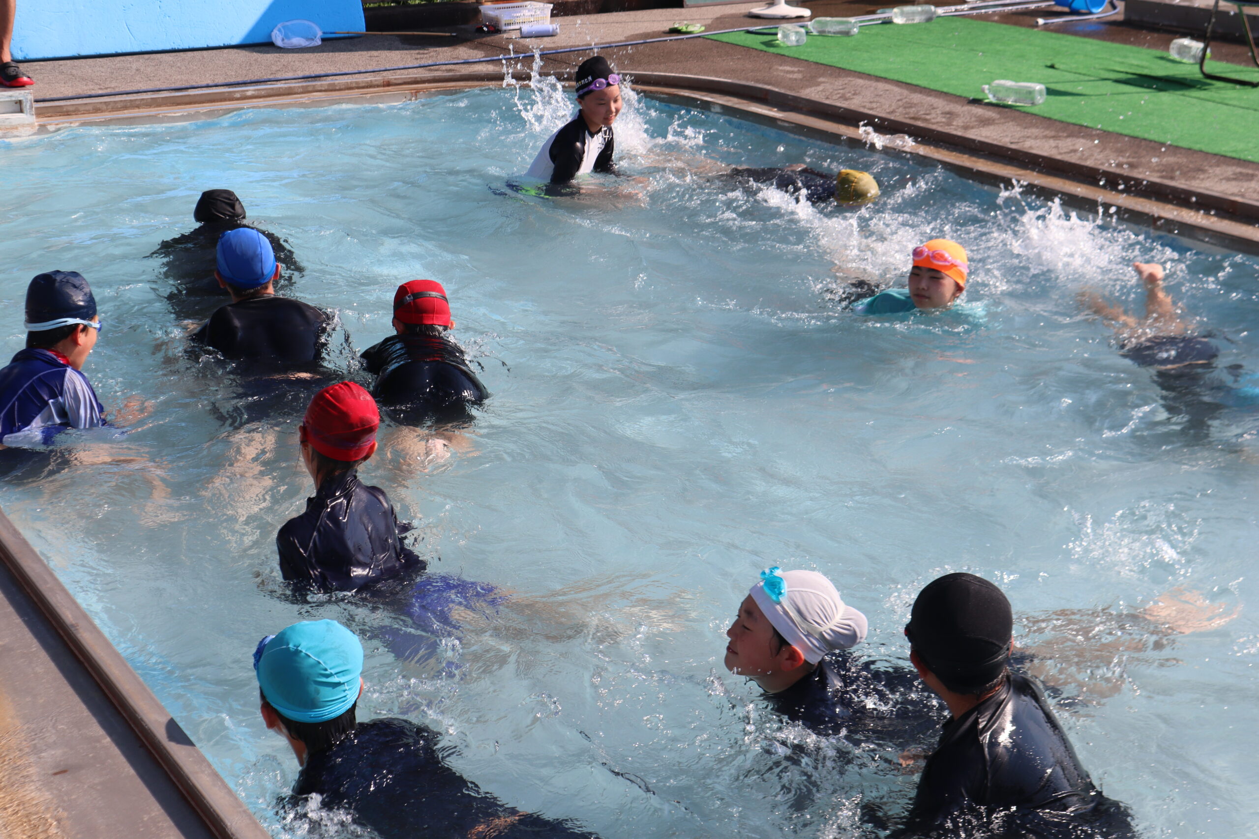 今日は最後の水泳の授業で、全学年合同で、着衣泳を行いました。 はじめに…