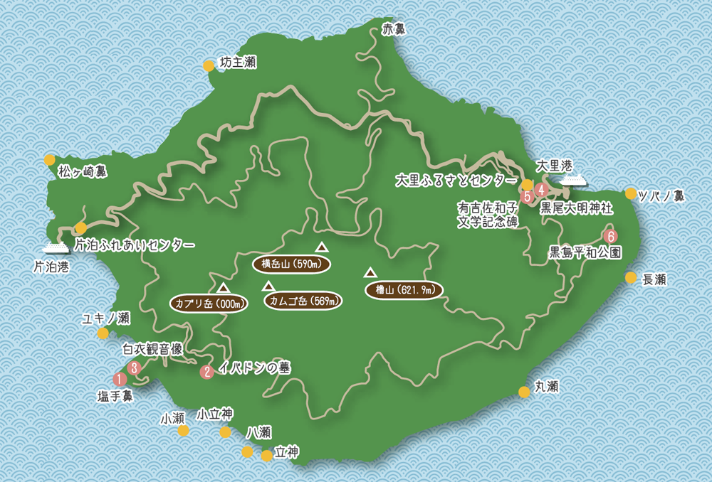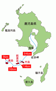 黒島は鹿児島市から航路で約150km余りのところ,北緯30°50′,東経129°58′の位置にあります。