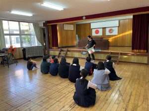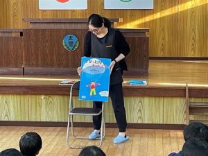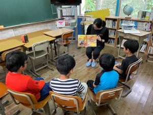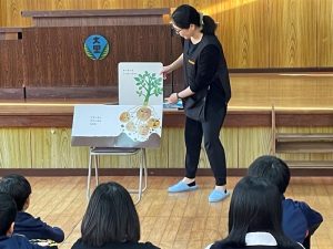 朝の活動で、県立図書館から来ていただいた拾三原先生に読み聞かせをしていただきました。