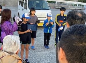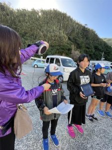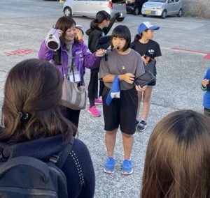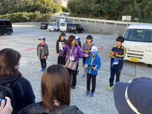 子どもたちが大里のことを伝えるために学校から港に出発する様子です。