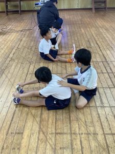 ペアになって、柔軟体操を入念に行いました。