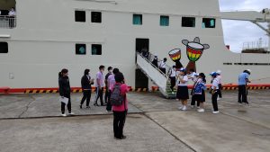 大里港で解散式を行い,船上の三島片泊学園の皆さんを見送りました。