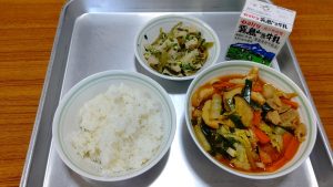 メニューは,『牛乳・麦ごはん・キムチうどん・茎わかめのきんぴら』でした。