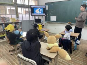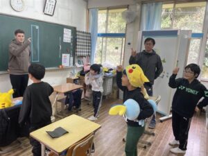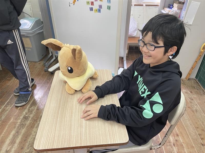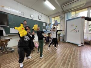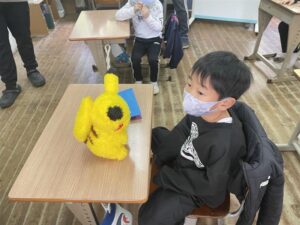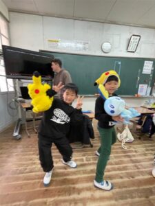 英語でポケモンダンス♫ 投稿者: 三島村立 三島大里学園 2024年3月4日2024年3月4日 4校時 外国語活動 1・2・3年 ポケモン好きのトーマス先生が、ポケモンの人形を持ってきてくれました。 かわいい💕😆 みんなのお気に入りキャラクターを貸してもらい、ダンスを覚えています。 おや、首に巻いているポケモンは? ミニリュウかな?! イーブイと一緒に動画を観ています。 それでは、練習スタート!! 本番です。先生方の前でキレキレのダンスをみせてくれました。 最後に決めポーズ!!決まった!!! ダンスが決まって、嬉しそうにピース!!
