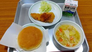 『牛乳・バーガーパン・コンソメスープ・手作り魚フライ・ゆでキャベツ』でした。