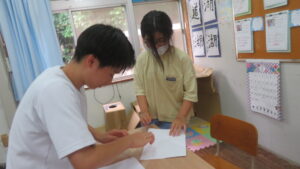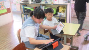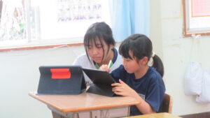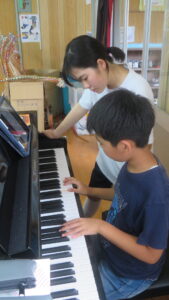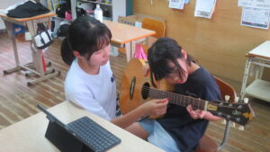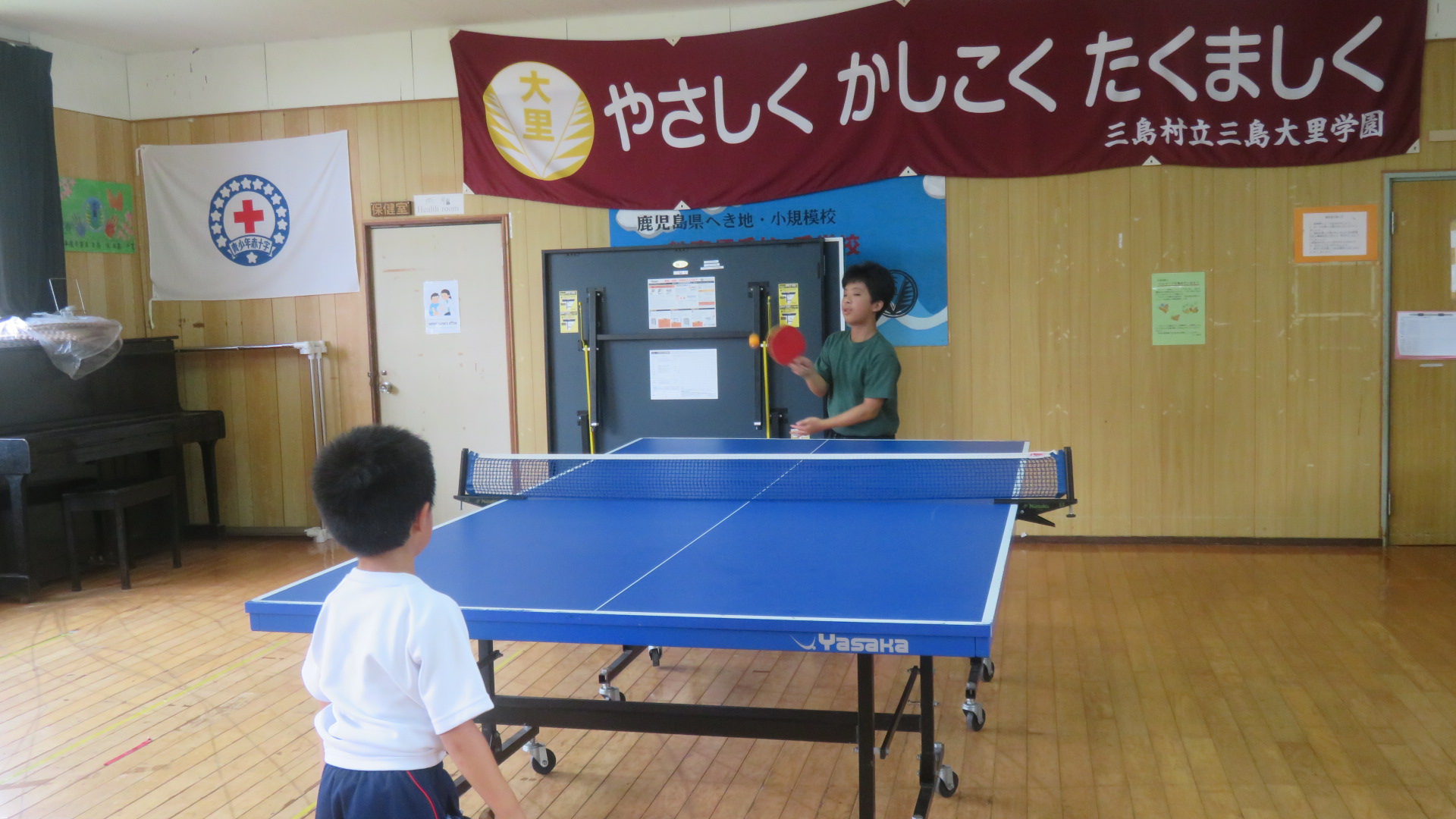 大里郷中教育をしました!! 投稿者: 三島村立 三島大里学園 2025年6月30日 大里郷中教育とは・・・ 児童生徒どうしが教え合う時間を設けることによって、自己有用感や自己肯定感を育み、学習内容の定着を図ることが目的となっています。後輩が知りたいことを先輩が事前に聞いたり調べたりして教えるという、第1回目が行われました。卓球やギター、ピアノ、算数などいろいろな分野を学んでいました♪ みんな笑顔でお互い学ぶことができていました。また次回が楽しみです!!