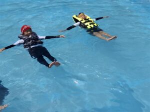 着衣泳とは水泳の泳法ではなく、水難・水害事故の多くは衣服を着ている状態で起こる事が多く、水辺での不慮の事故への対処方法として、1990年代から小学校の授業などで浮くことを重視した着衣泳の指導が行われるようになってきました。着衣や持ち物に備わっている浮力の助けを借りながら水に浮く方法を、ペットボトルなどを使いながら学ぶことが重視されています。