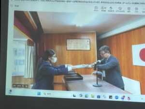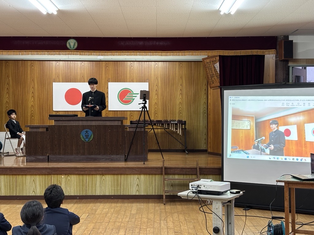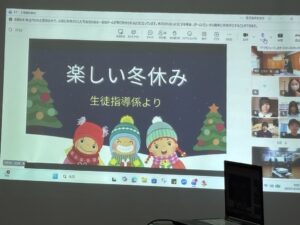 12月24日(水)に三島村立三島大里学園で、令和7年度2学期終業式が行われました。しおかぜ留学生の児童生徒は、リモートで参加しました。前期後期課程の代表の2人が、2学期の楽しかったことや成長したことを発表しました。校長先生の話、生徒指導係の話、保健係の話、「体調管理に気をつけて、3学期、笑顔で会いましょう!!」という共通していましたね。2学期、たくさんの行事がありましたが、みなさんの笑顔が毎回見ることができました。また3学期も、みんなで笑顔の学校生活を過ごしましょう!!