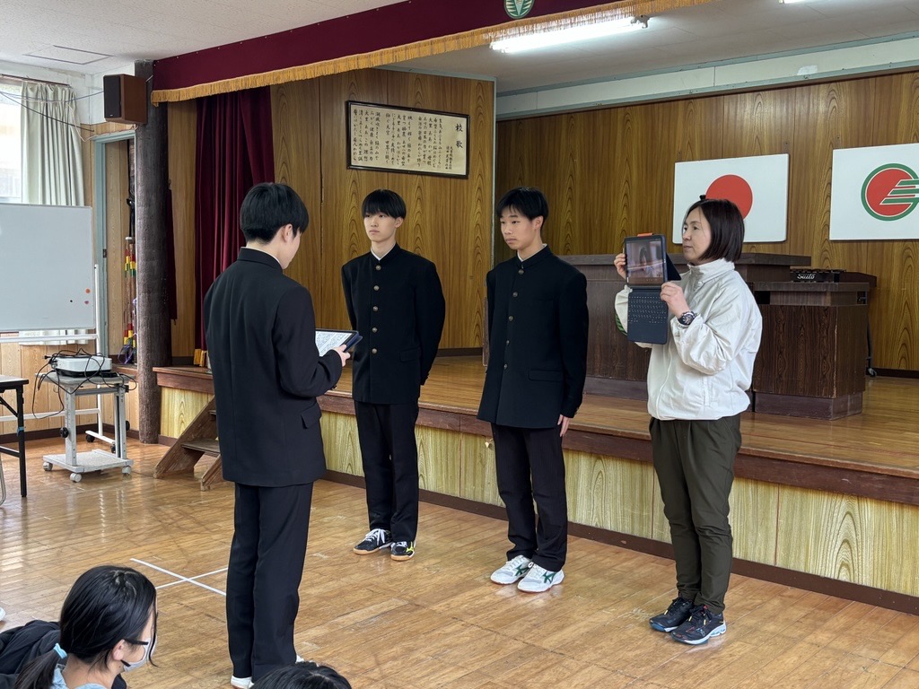 9年生へ!!入試激励会!! 投稿者: 三島村立 三島大里学園 2026年1月14日 3学期が始まり、9年生もいよいよ入試本番となっていきます。入試激励会では、9年生の3人が、意気込みを述べ、その気持ちを聞いて、三島大里学園の後輩から、激励の言葉がありました。生徒会長から「今まで頑張ってきてことを発揮してください!!」学園だけではなく、地域の方も応援しています。体調管理を整えて、万全な体勢で頑張ってきてください!! 「フレー、フレー、9年生!!」