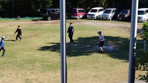 早速授業参観,そして,昼休みは子どもたちが迎えに来て,鬼ごっこの真っ最中です。