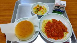 今日のメニューは「牛乳・米粉パン・スパゲッティミートソース・コールスローサラダ」でした。
