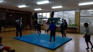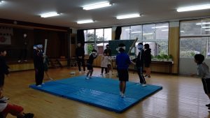 目隠しをして,剣(と言っても,新聞紙を軽くロール状にしたもの もちろん安全!)で見えない敵と戦う!という遊びです。