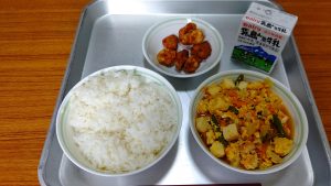 『 牛乳・麦ごはん・炒り豆腐・ちくわの粉茶揚げ 』でした。