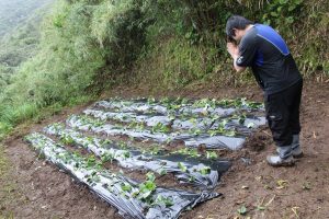 一つずつ丁寧に,芋畑担当の先生も願いを込めます!
