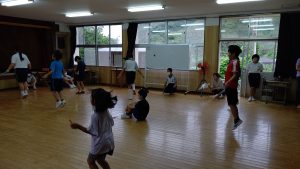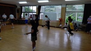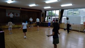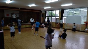 前回は,校庭を走りましたが,今日は集会室で縄跳びをしました。