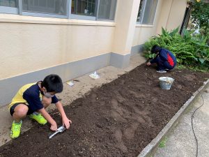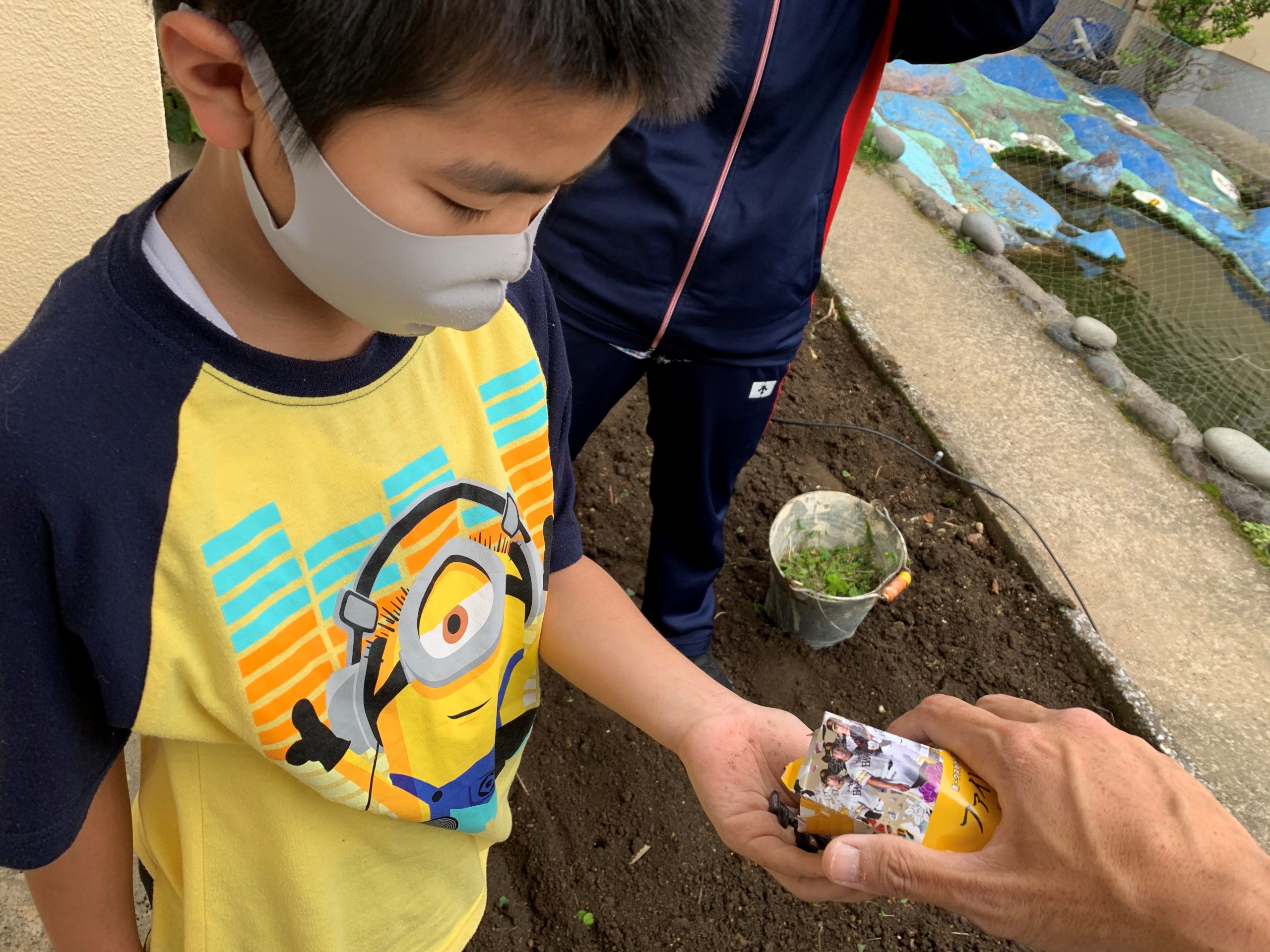 梅雨の晴れ間に 投稿者: 三島村立 三島大里学園 2021年5月26日 三島大里学園は今年、福岡ソフトバンクホークスが主催する 「ファイト九州「笑顔の花を咲かせよう!」プロジェクト」 に応募してヒマワリの種をたくさん頂くことができました。 昨日のフェリーで種が届いたので、早速花壇に植えていきます。 種と一緒に頂いたポスターにも、子どもたちは興味津々でした。 ヒマワリの花言葉は『笑顔、元気』だそうです。 子どもたちもヒマワリと一緒にすくすくと元気に笑顔で成長していって欲しいなと思う一日でした。
