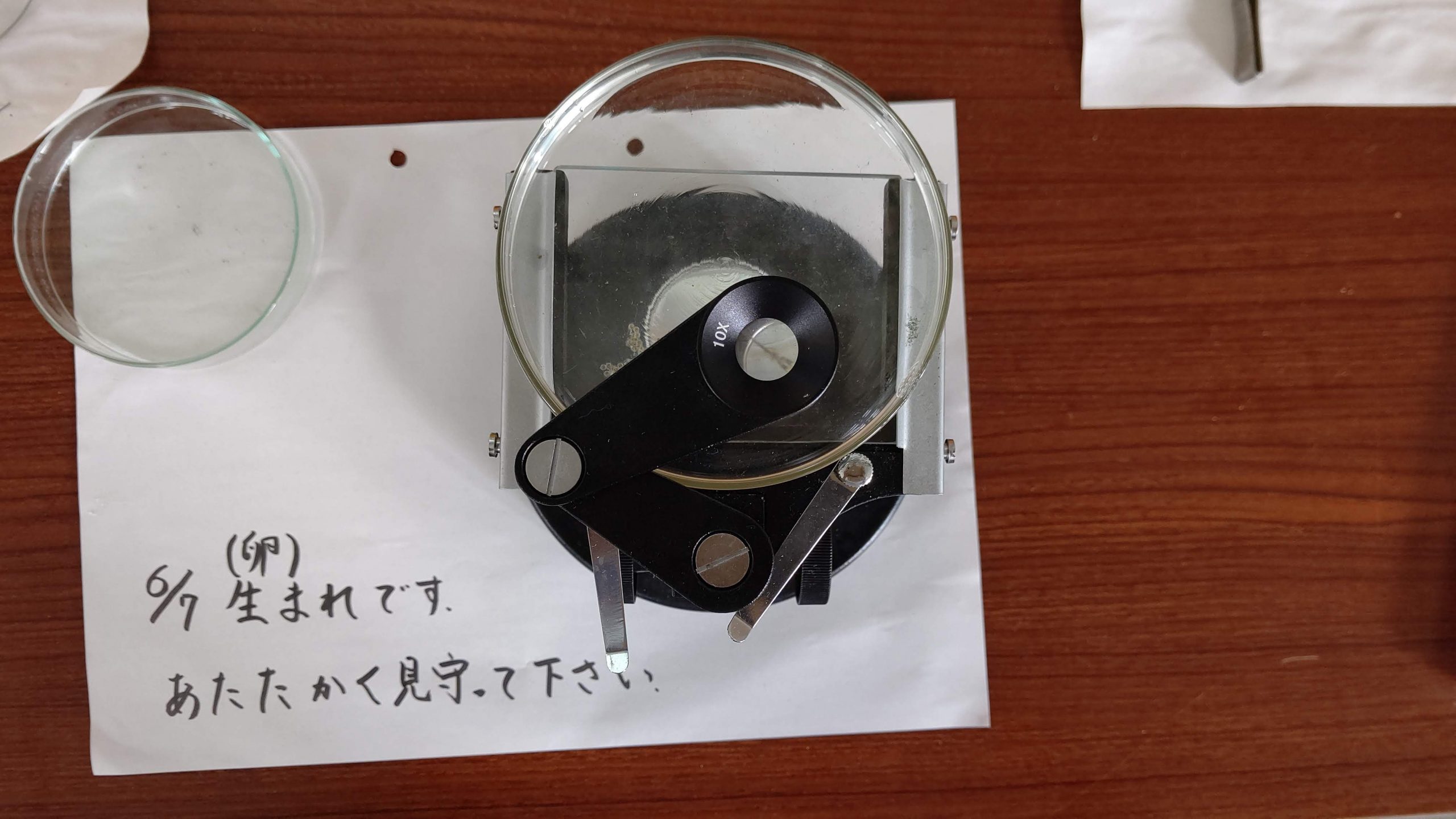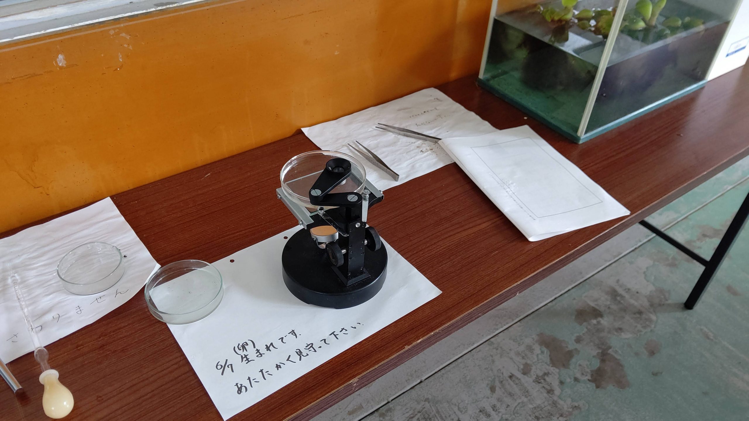 卵が孵り,一匹泳いでいました。昼休みはいなかったそうで,生まれたばかりのようです。(5時間目撮影)