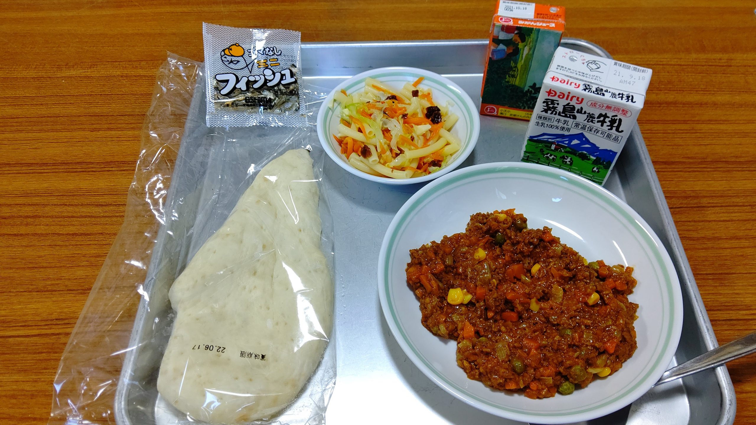 メニューは『 牛乳・小魚・ナン・ドライカレー・レーズンとチーズのサラダ・ミカン果汁 』