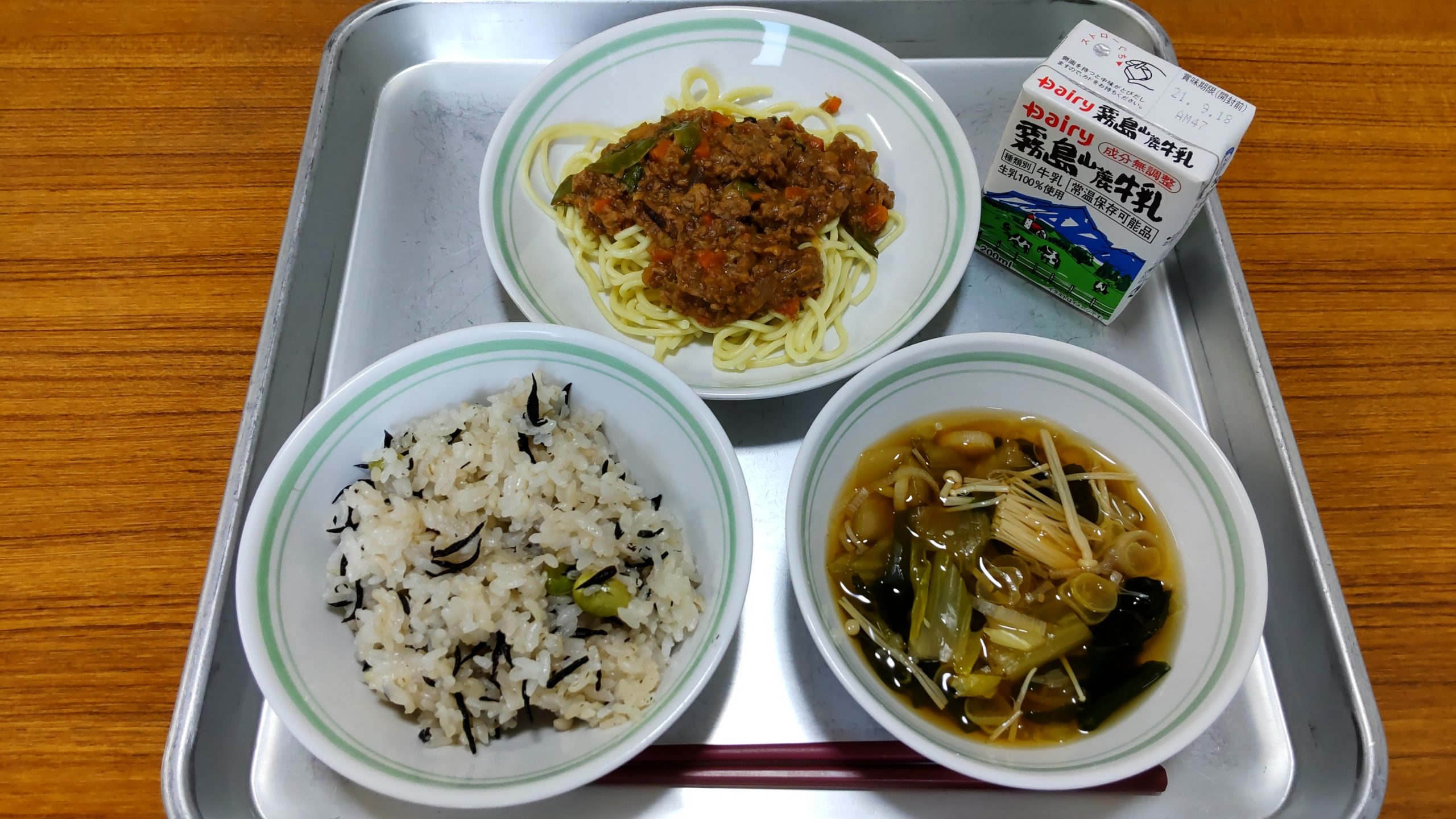 『 牛乳・ひじきと枝豆ご飯・小ジャージャー麺・わかめと青梗菜のスープ 』でした。