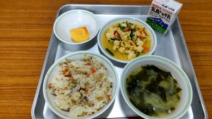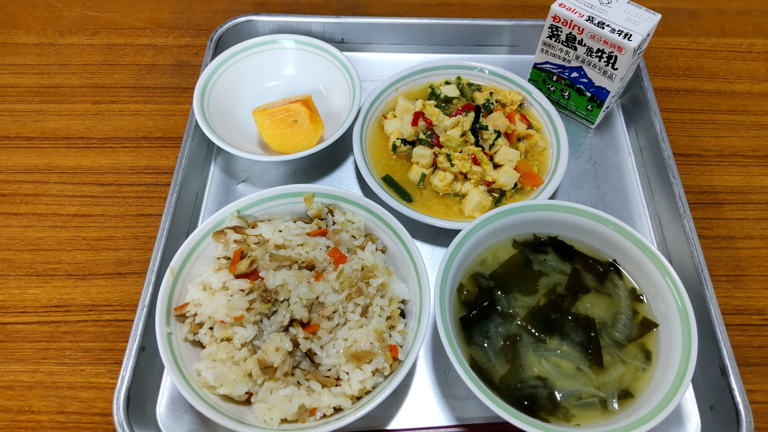 『 牛乳・鶏ときのこの炊き込みご飯・海老と豆腐の卵炒め・生姜とわかめの味噌汁・かき 』でした。