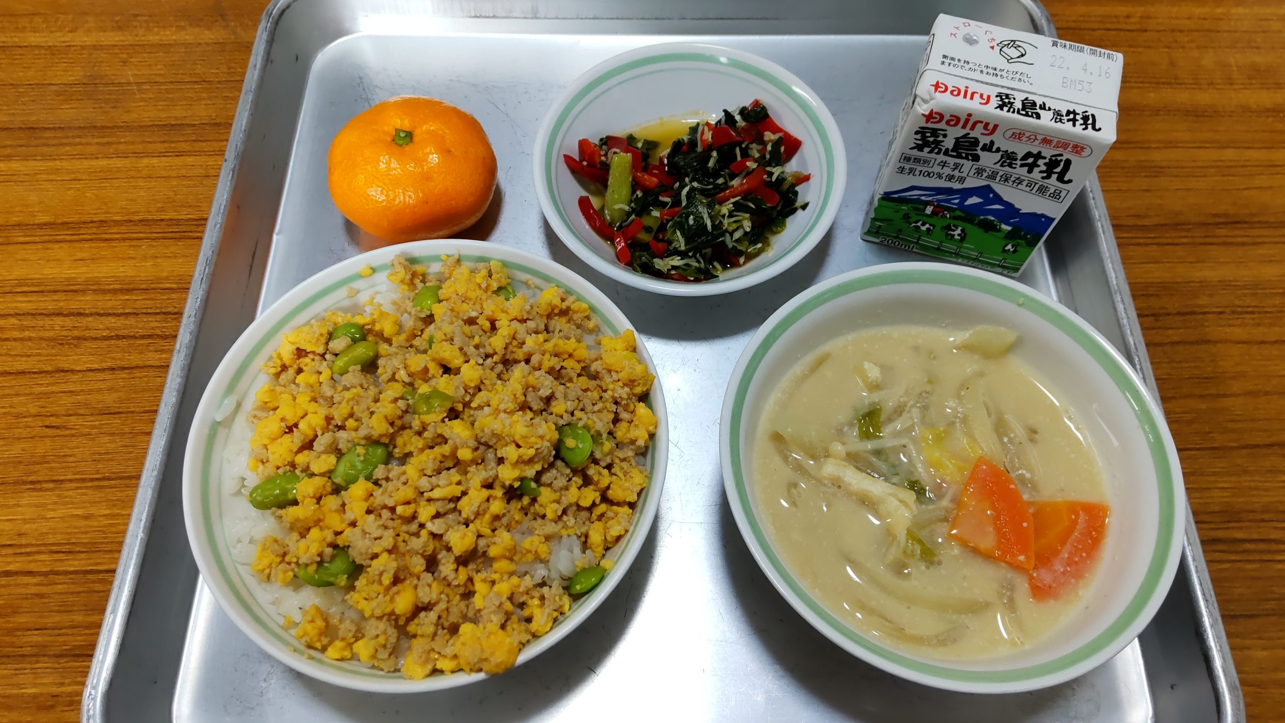 『 牛乳・親子そぼろご飯・小松菜とピーマンの炒め物・白菜の豆乳味噌汁・みかん 』でした。