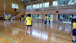 この後、海でのレクレーションの予定でしたが、雨と雷のため体育館でのレクに予定変更。