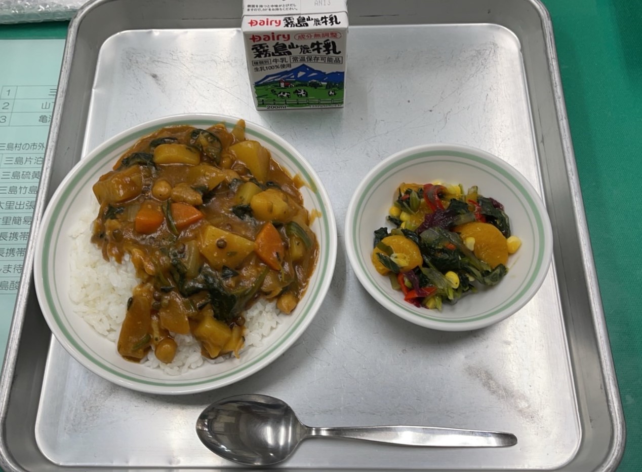 今日の献立は、「麦ごはん・ほうれん草と豆カレー・さっぱりサラダ・牛乳」です!