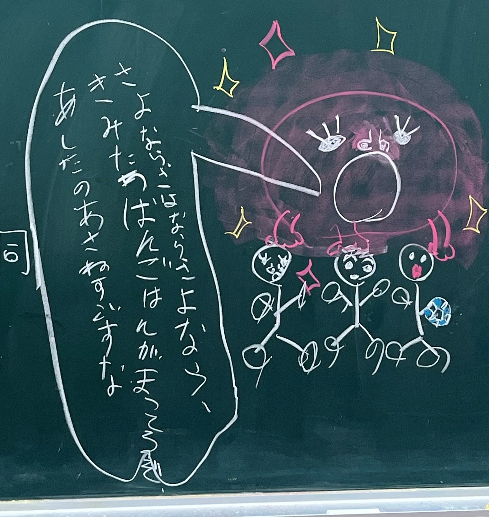 「あしたのあさ ねすごすな」と呼びかける夕日と、それに元気よく返す子ども達のやりとりが描かれていました😊