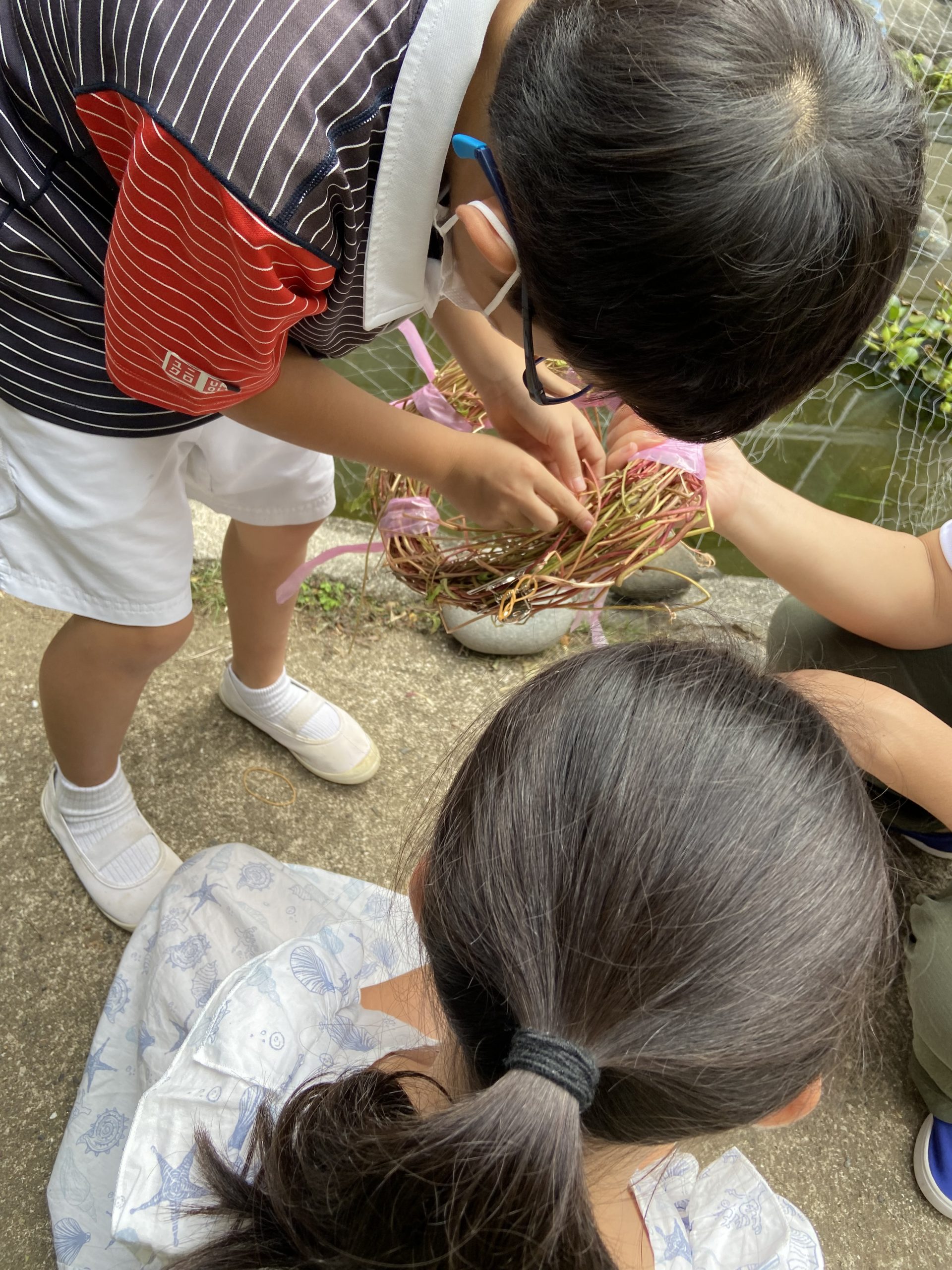 1学期に育てていた朝顔のつるでリースをつくっていました!