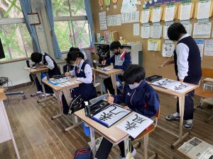 心を落ち着かせ、学習発表会で展示する習字をしています。