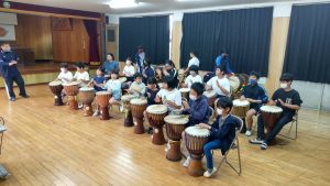 12月のポンカン収穫に向け、学校の向かいにある山で作業をしていたらジャンベの音が聞こえてきました!