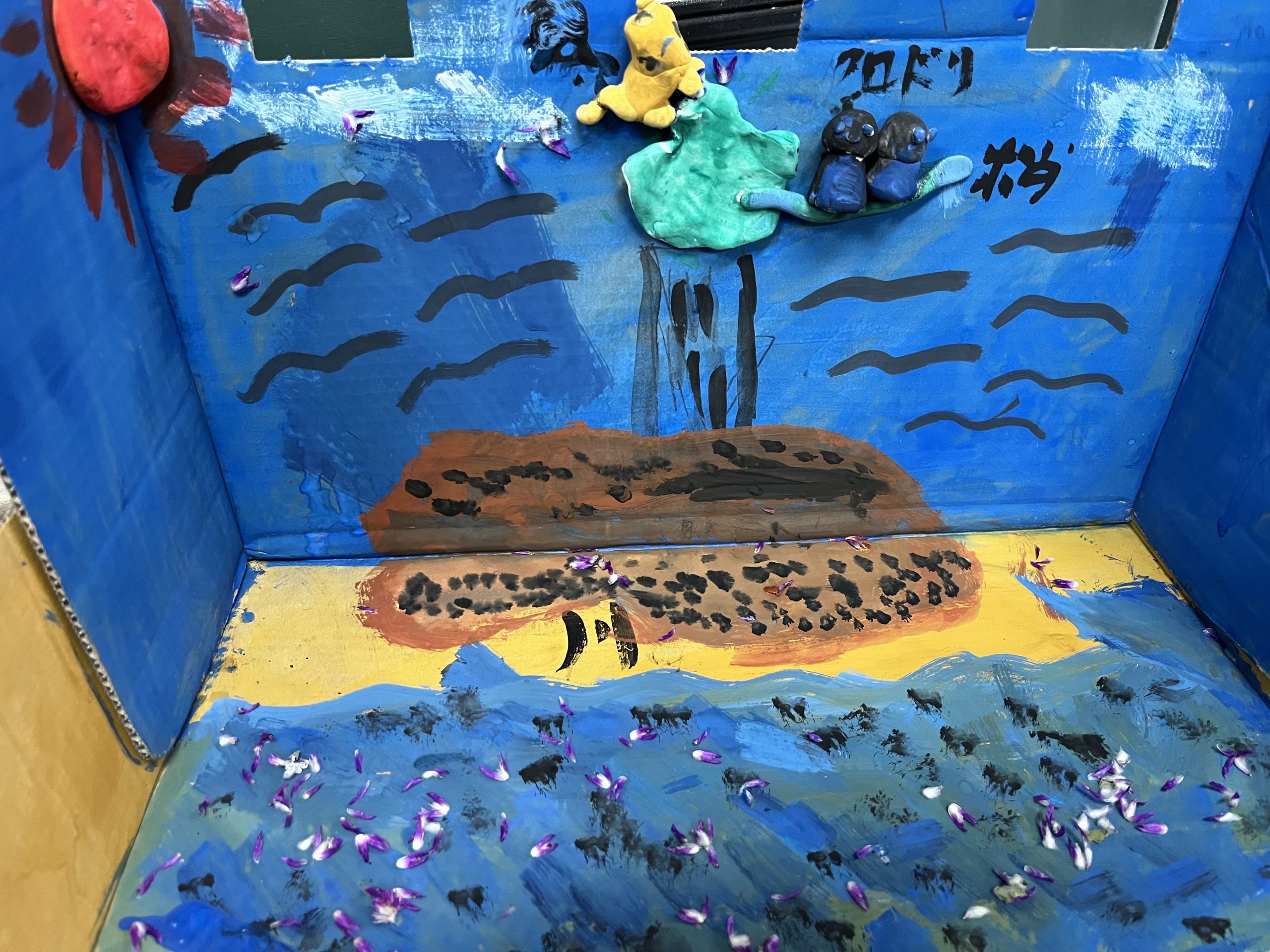 クロドリを粘土で作り、川の魚を花びらで表現しています!