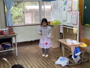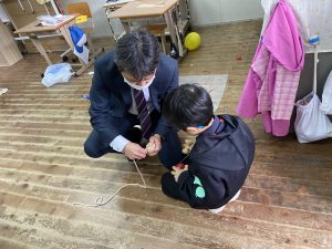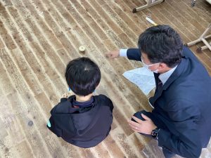 校長先生にレクチャーをしてもらいコマ回しに挑戦!