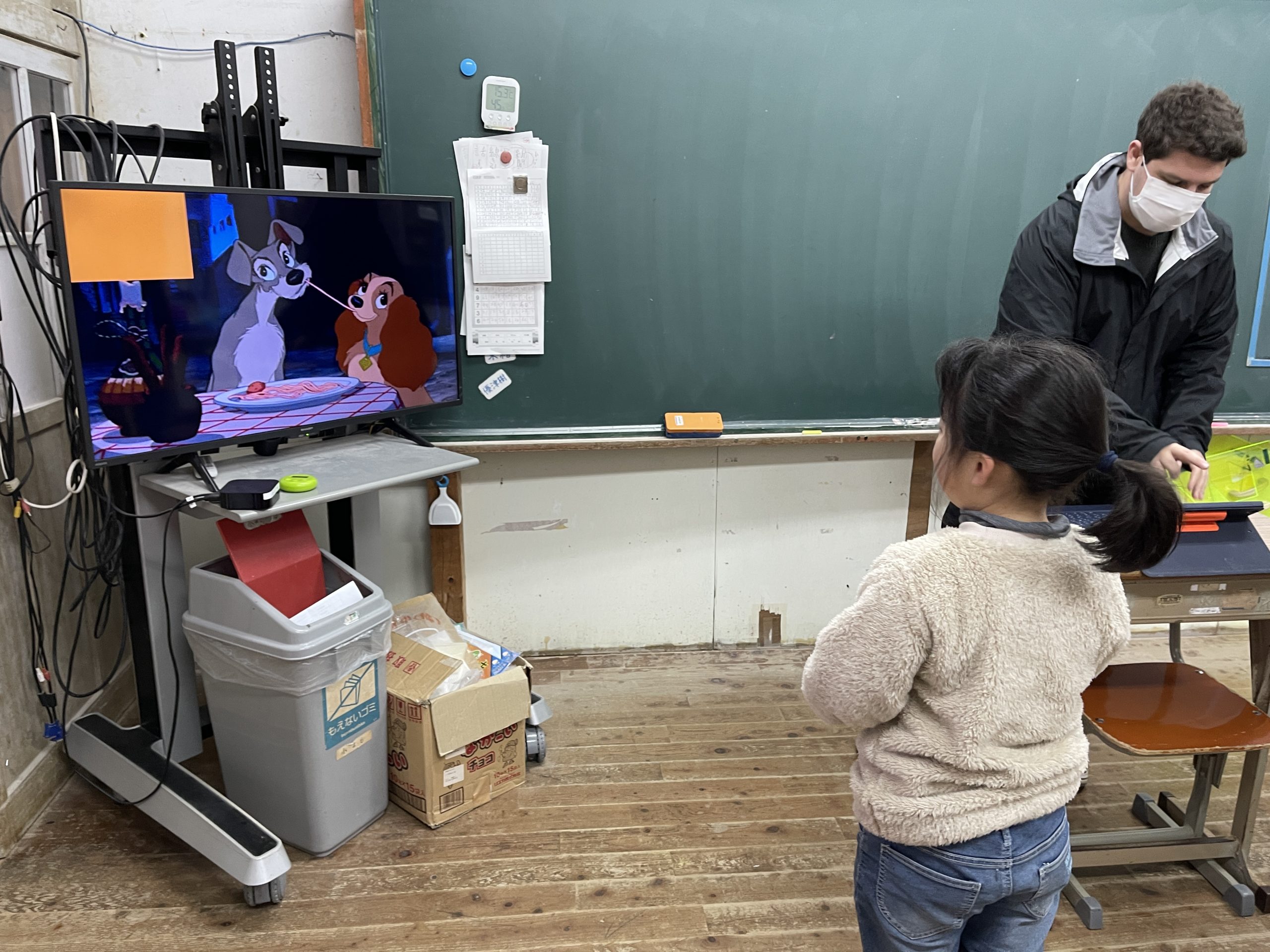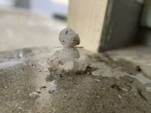 少しだけ積もった雪で2年生の2人が雪だるまをつくっていました。