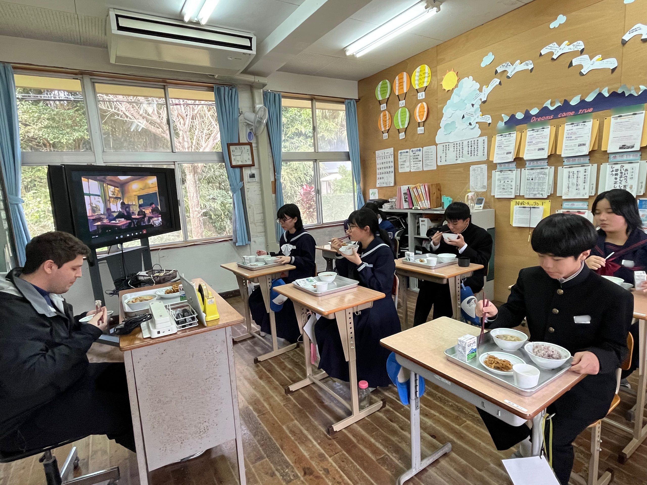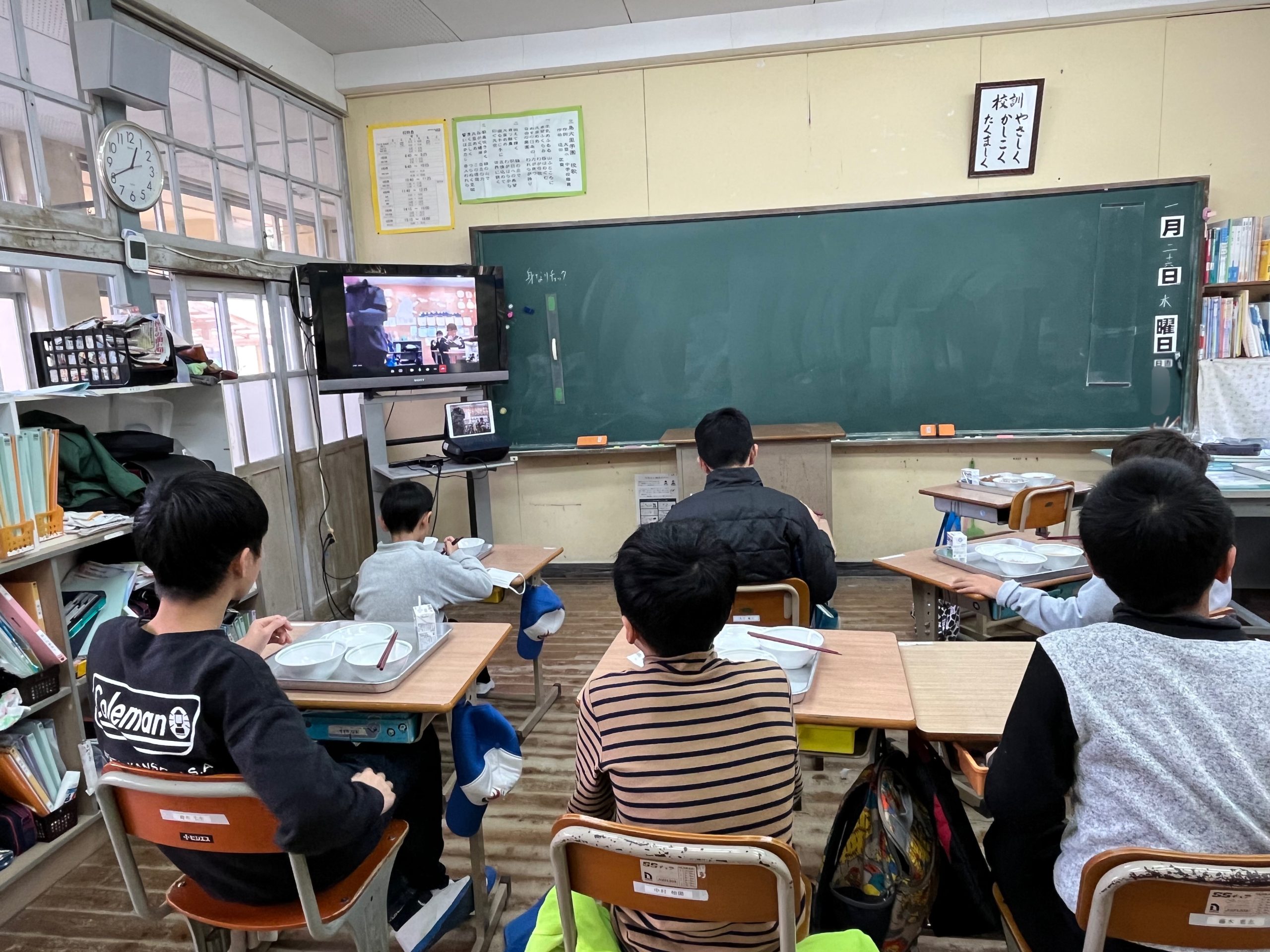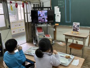 今日は、それぞれの学年をオンラインで繋ぎ、合同給食を行いました!