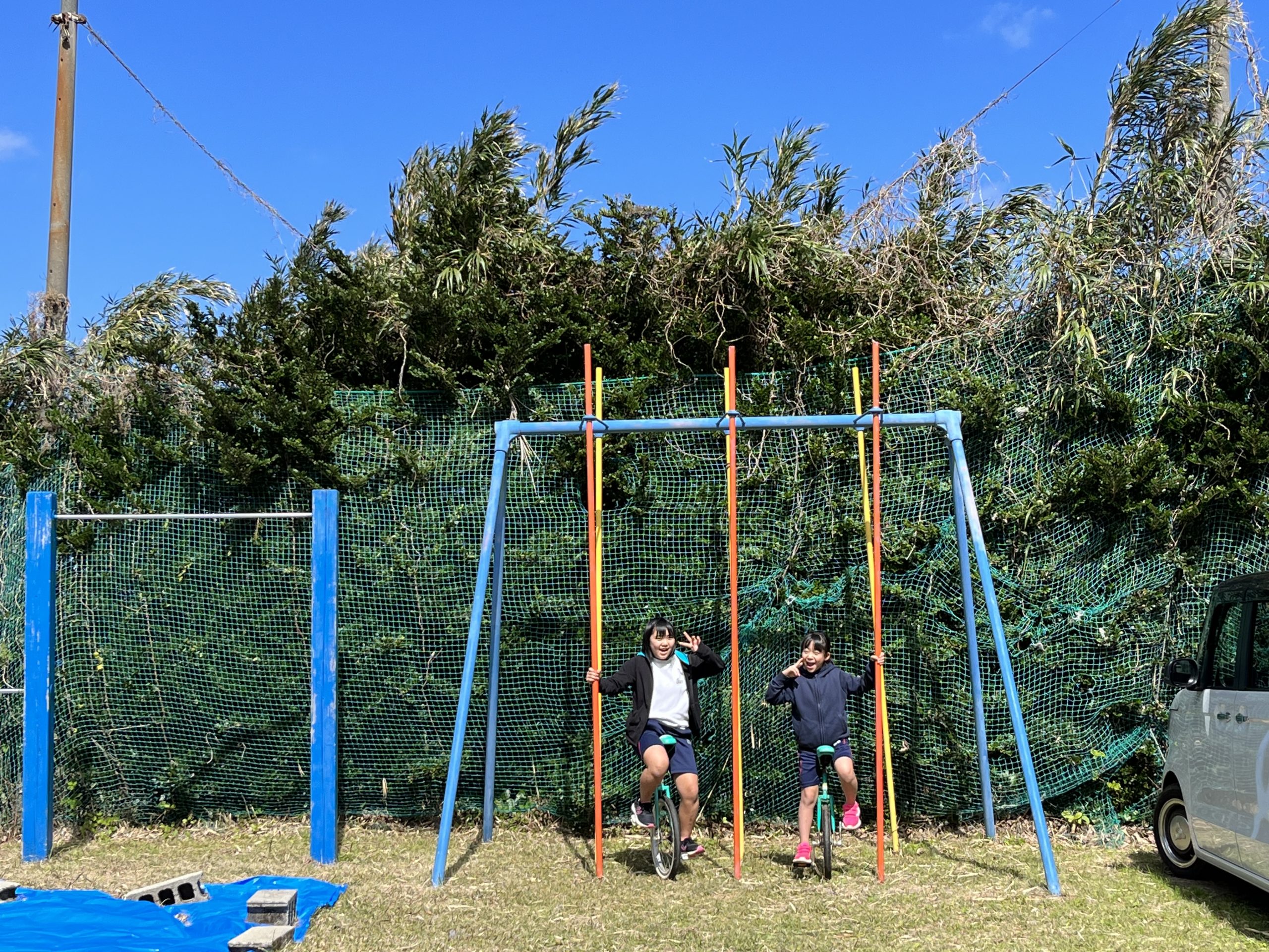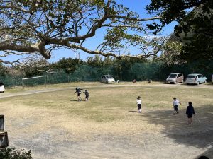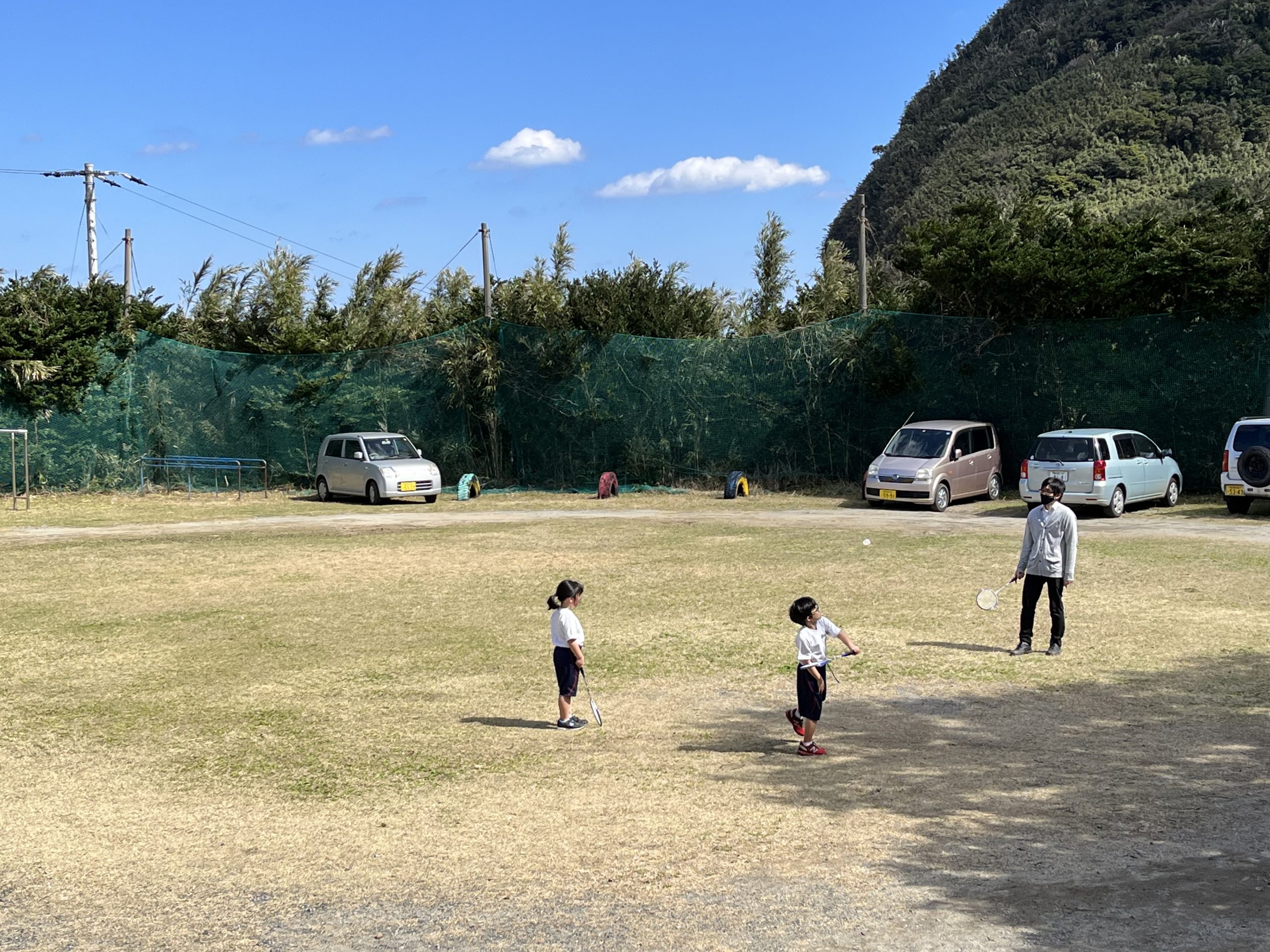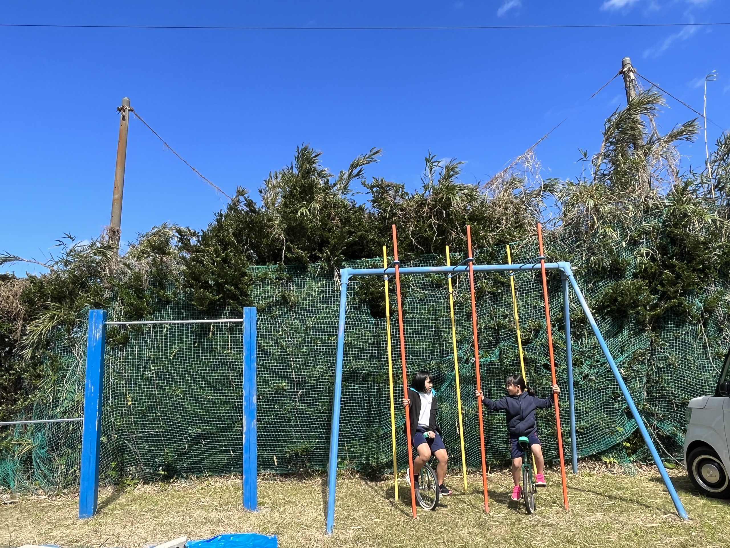 校庭では、子ども達がバドミントンや一輪車をしています!