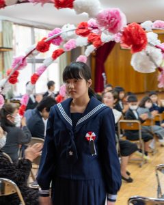 花のアーチをくぐって、大きな拍手の中、新入生・進級生が入場します♬